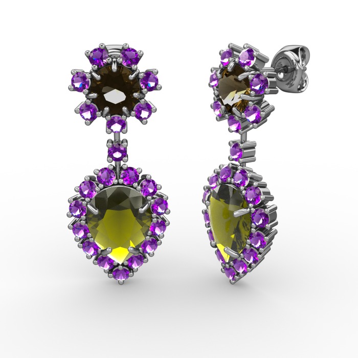 Peridot, ametist ve dumanlı kuvars 8 ayar beyaz altın küpe
