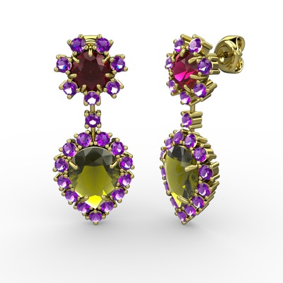 Peridot, ametist ve rodolit garnet 8 ayar altın küpe