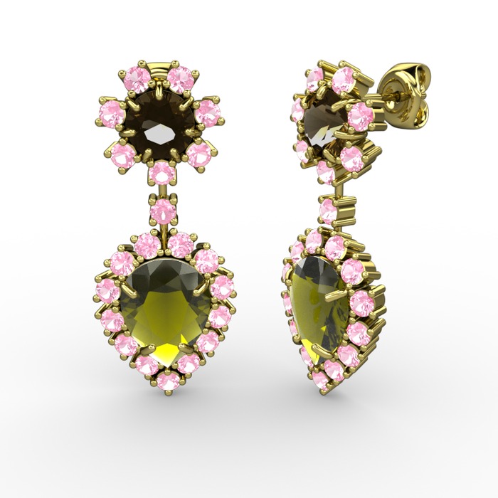 Peridot, pembe kuvars ve dumanlı kuvars 18 ayar altın küpe