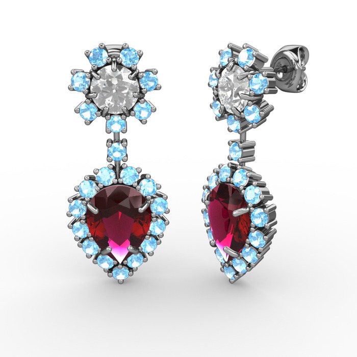Rodolit garnet, akuamarin ve beyaz zirkon 18 ayar beyaz altın küpe
