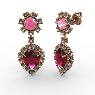 Rodolit garnet, dumanlı kuvars ve pembe kuvars 14 ayar rose altın küpe