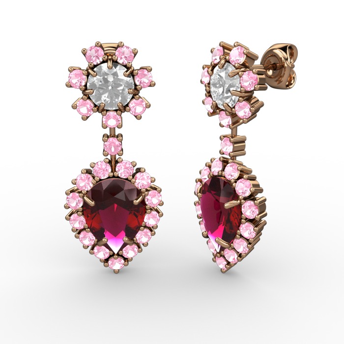 Rodolit garnet, pembe kuvars ve swarovski 8 ayar rose altın küpe