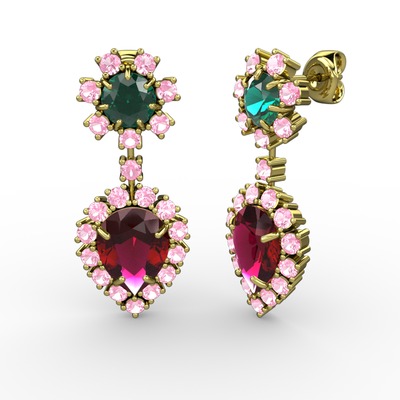 Rodolit garnet, pembe kuvars ve yeşil kuvars 14 ayar altın küpe