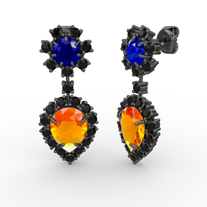 Sitrin, siyah zirkon ve lab safir 925 ayar siyah rodyum kaplama gümüş küpe
