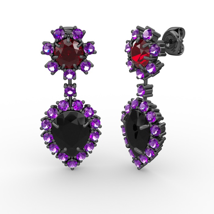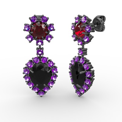 Siyah zirkon, ametist ve garnet 925 ayar siyah rodyum kaplama gümüş küpe