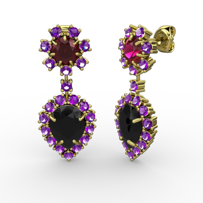 Siyah zirkon, ametist ve rodolit garnet 8 ayar altın küpe