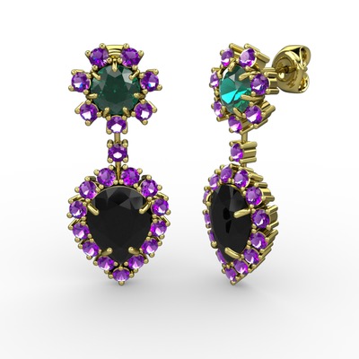 Siyah zirkon, ametist ve yeşil kuvars 8 ayar altın küpe