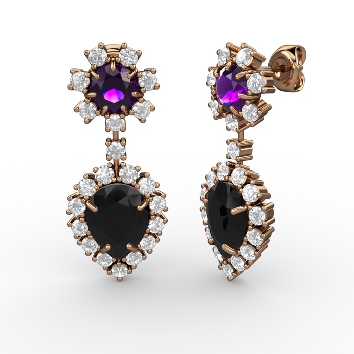 Siyah zirkon, beyaz zirkon ve ametist 8 ayar rose altın küpe