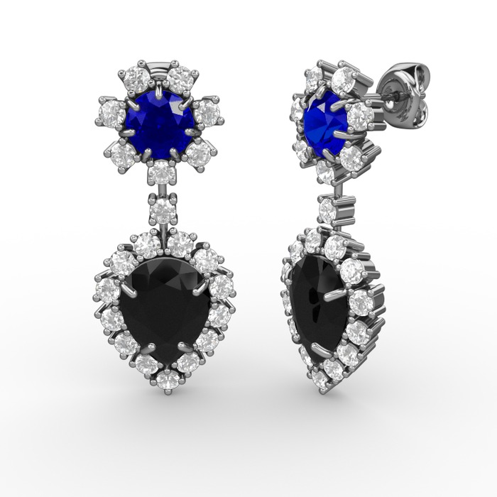 Siyah zirkon, beyaz zirkon ve lab safir 14 ayar beyaz altın küpe