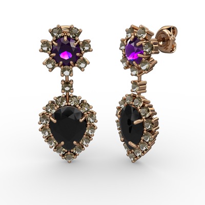 Siyah zirkon, dumanlı kuvars ve ametist 18 ayar rose altın küpe
