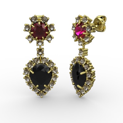 Siyah zirkon, dumanlı kuvars ve rodolit garnet 18 ayar altın küpe
