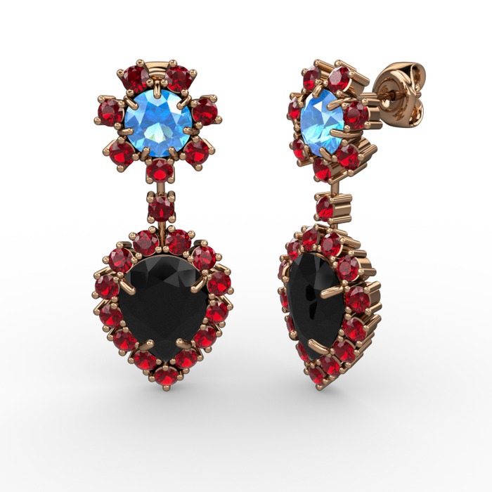 Siyah zirkon, garnet ve akuamarin 14 ayar rose altın küpe