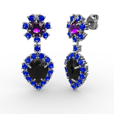Siyah zirkon, lab safir ve ametist 18 ayar beyaz altın küpe