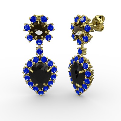 Siyah zirkon, lab safir ve dumanlı kuvars 8 ayar altın küpe
