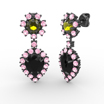 Siyah zirkon, pembe kuvars ve peridot 925 ayar siyah rodyum kaplama gümüş küpe