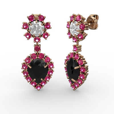 Siyah zirkon, rodolit garnet ve beyaz zirkon 14 ayar rose altın küpe