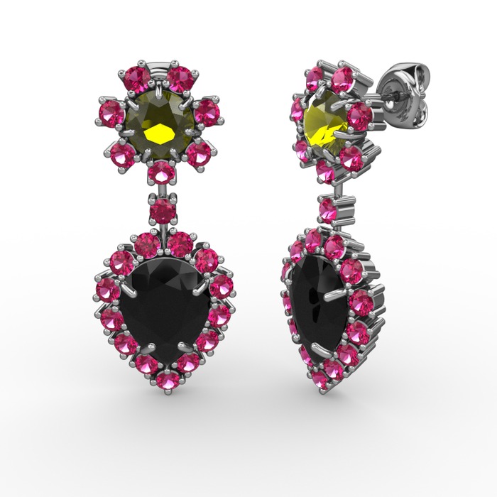 Siyah zirkon, rodolit garnet ve peridot 18 ayar beyaz altın küpe