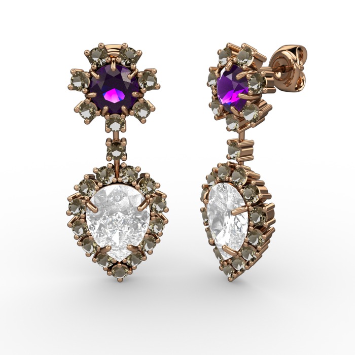 Swarovski, dumanlı kuvars ve ametist 14 ayar rose altın küpe