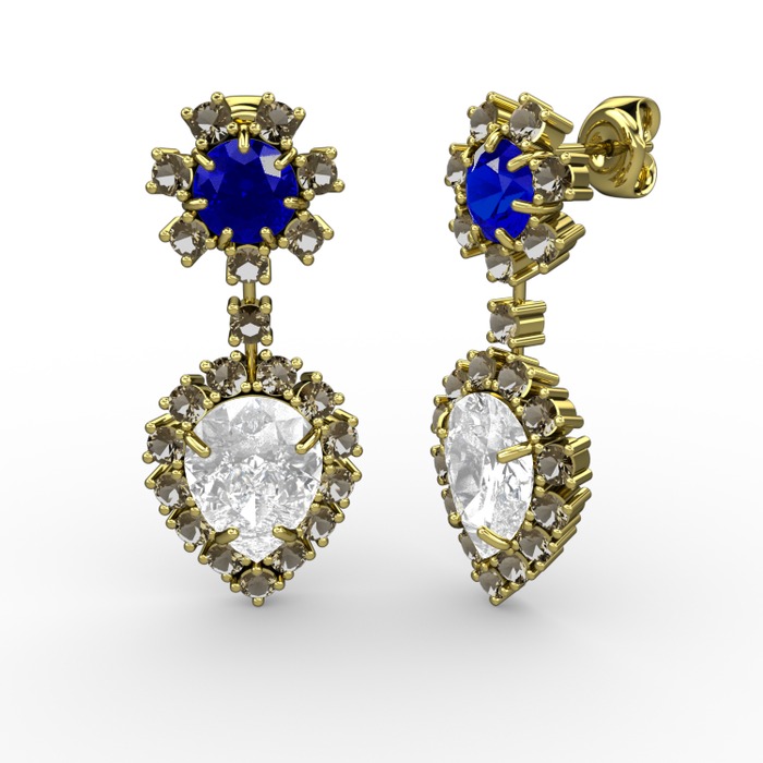 Swarovski, dumanlı kuvars ve lab safir 18 ayar altın küpe