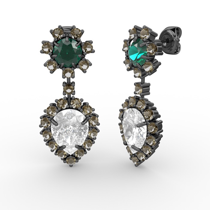 Swarovski, dumanlı kuvars ve yeşil kuvars 925 ayar siyah rodyum kaplama gümüş küpe