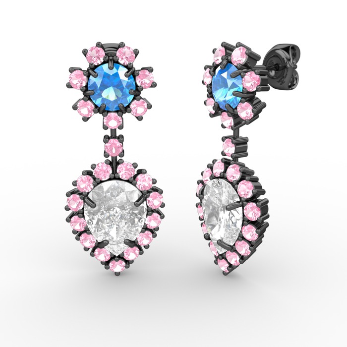 Swarovski, pembe kuvars ve akuamarin 925 ayar siyah rodyum kaplama gümüş küpe