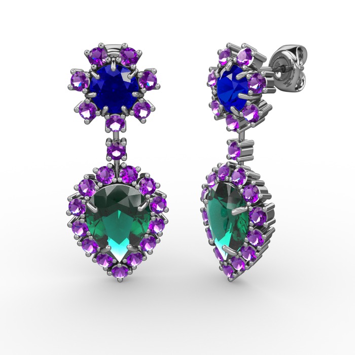 Yeşil kuvars, ametist ve lab safir 14 ayar beyaz altın küpe