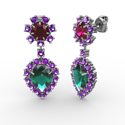 Yeşil kuvars, ametist ve rodolit garnet 14 ayar beyaz altın küpe