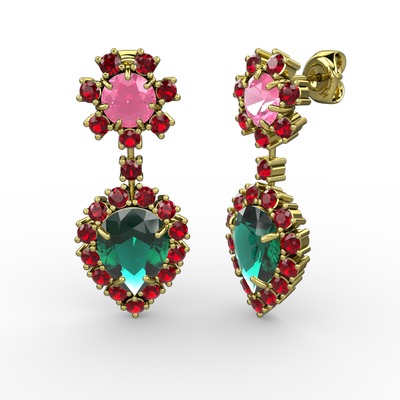 Yeşil kuvars, garnet ve pembe kuvars 14 ayar altın küpe