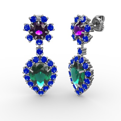 Yeşil kuvars, lab safir ve ametist 14 ayar beyaz altın küpe