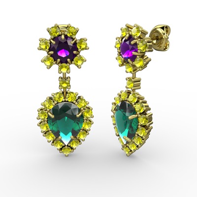 Yeşil kuvars, peridot ve ametist 18 ayar altın küpe