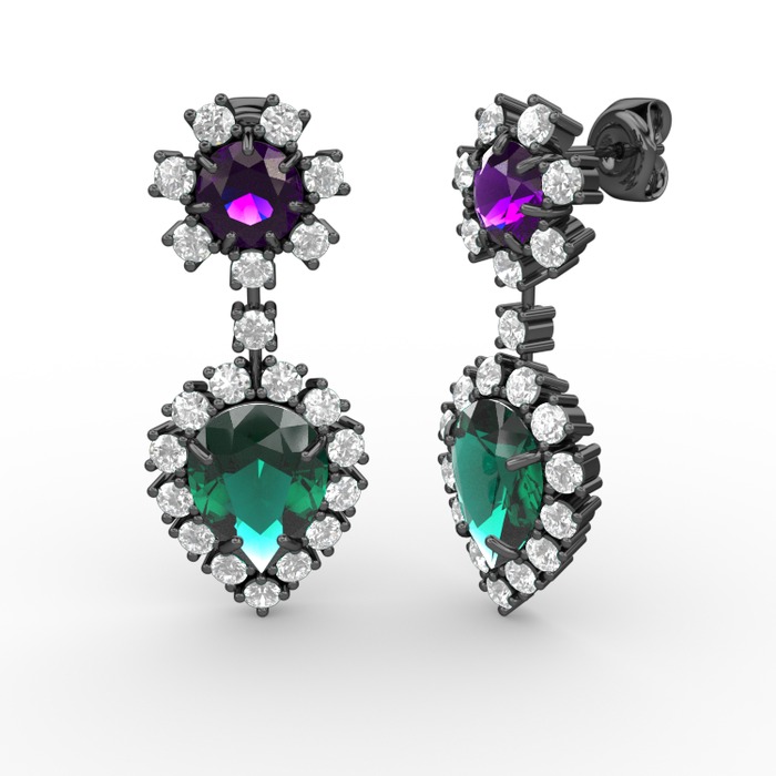 Yeşil kuvars, pırlanta ve ametist 925 ayar siyah rodyum kaplama gümüş küpe (0.792 karat)