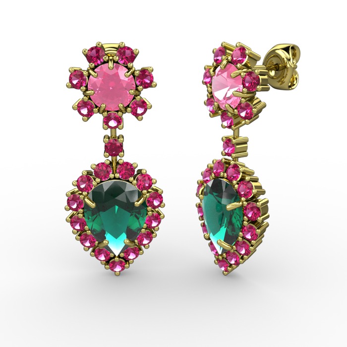 Yeşil kuvars, rodolit garnet ve pembe kuvars 18 ayar altın küpe