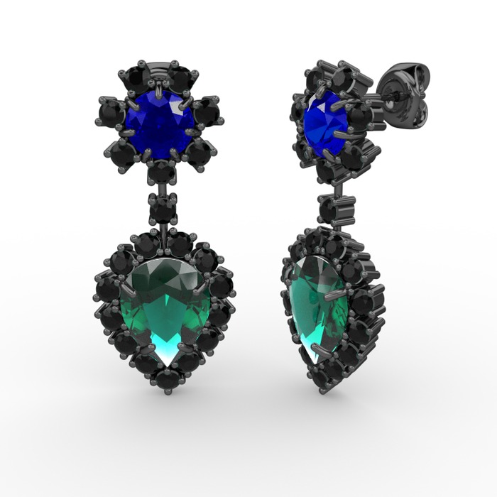 Yeşil kuvars, siyah zirkon ve lab safir 925 ayar siyah rodyum kaplama gümüş küpe