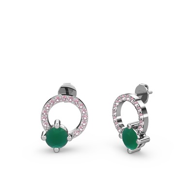 Kök zümrüt ve pembe kuvars 14 ayar beyaz altın küpe