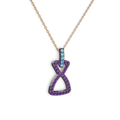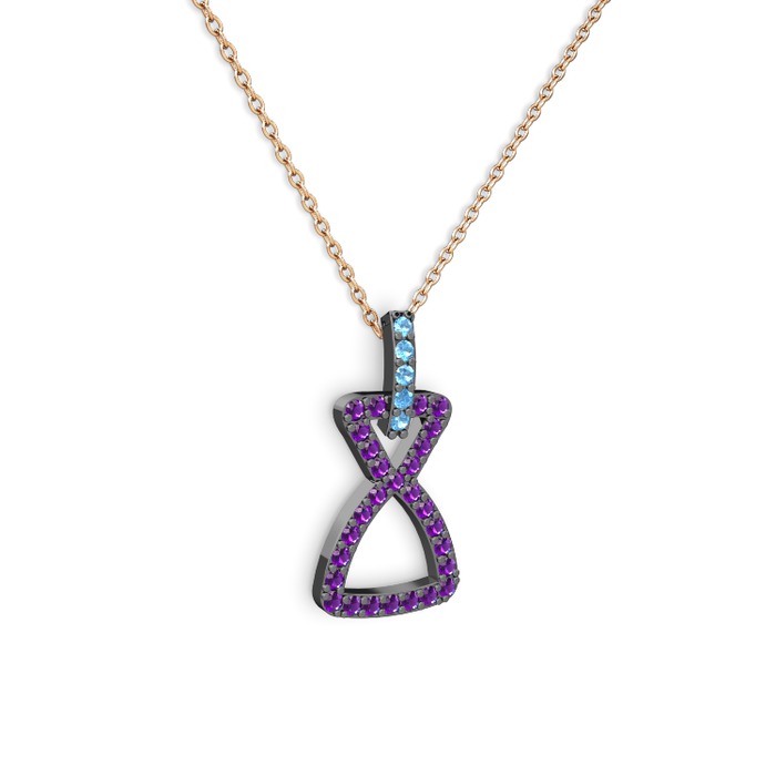 Akuamarin ve ametist 925 ayar siyah rodyum kaplama gümüş kolye (40 cm rose altın rolo zincir)
