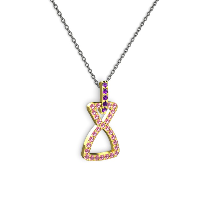 Ametist ve pembe kuvars 18 ayar altın kolye (40 cm gümüş rolo zincir)