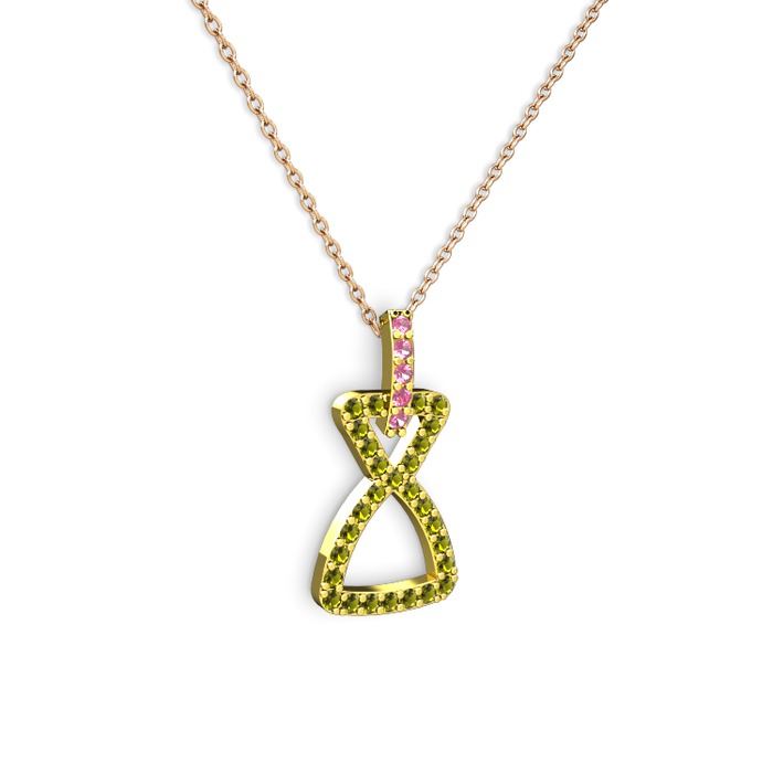 Pembe kuvars ve peridot 8 ayar altın kolye (40 cm gümüş rolo zincir)