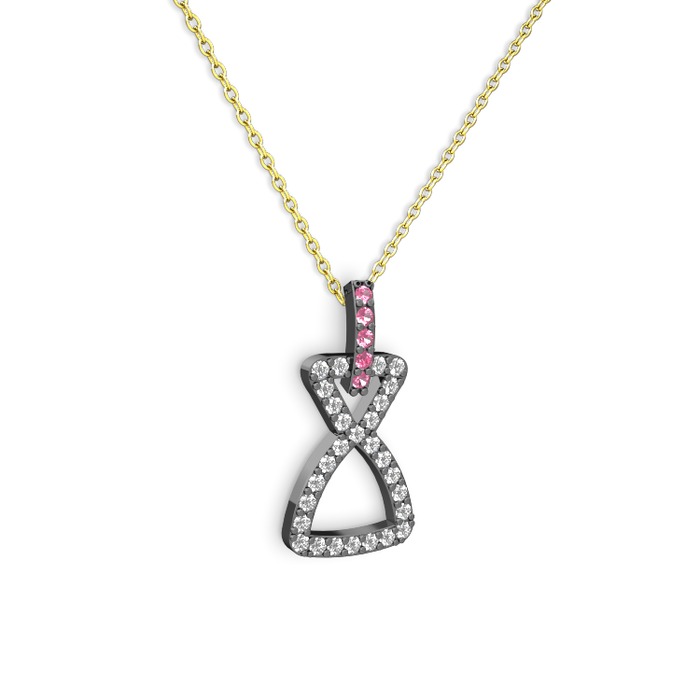 Pembe kuvars ve swarovski 925 ayar siyah rodyum kaplama gümüş kolye (40 cm altın rolo zincir)