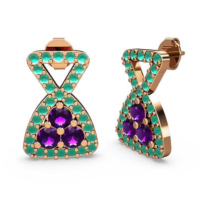 Kök zümrüt ve ametist 14 ayar rose altın küpe