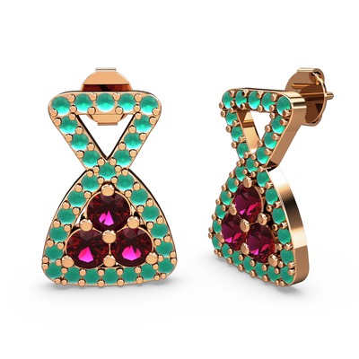 Kök zümrüt ve rodolit garnet 14 ayar rose altın küpe
