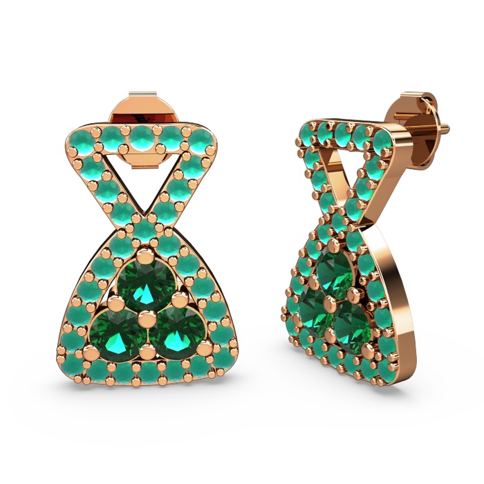 Kök zümrüt ve yeşil kuvars 14 ayar rose altın küpe