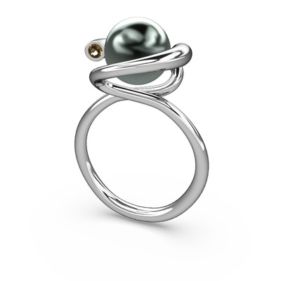 Siyah inci ve dumanlı kuvars 18 ayar beyaz altın yüzük