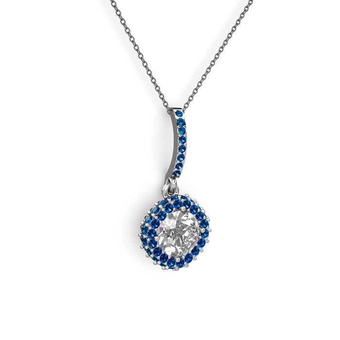Beyaz zirkon ve lab safir 14 ayar beyaz altın kolye (40 cm gümüş rolo zincir)