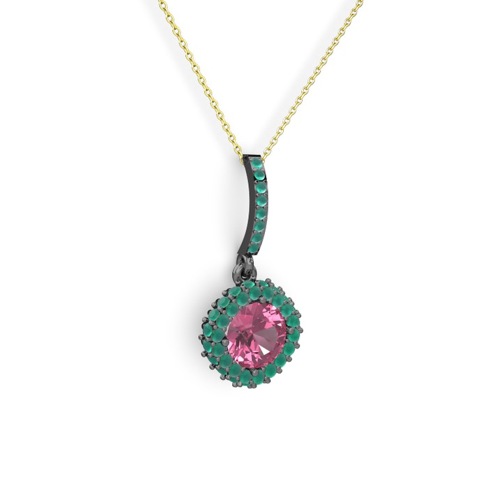 Pembe kuvars ve kök zümrüt 925 ayar siyah rodyum kaplama gümüş kolye (40 cm gümüş rolo zincir)