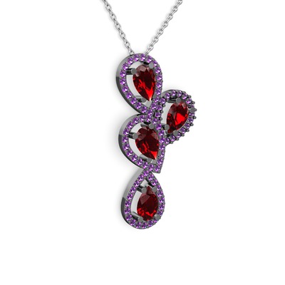 Garnet ve ametist 925 ayar siyah rodyum kaplama gümüş kolye (40 cm beyaz altın rolo zincir)