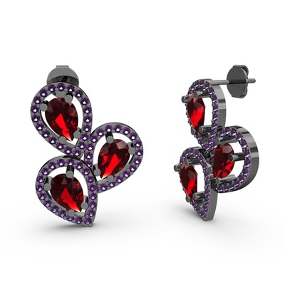 Ametist ve garnet 925 ayar siyah rodyum kaplama gümüş küpe