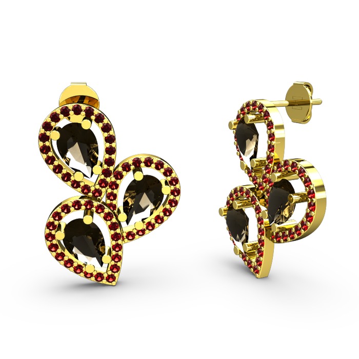 Garnet ve dumanlı kuvars 8 ayar altın küpe