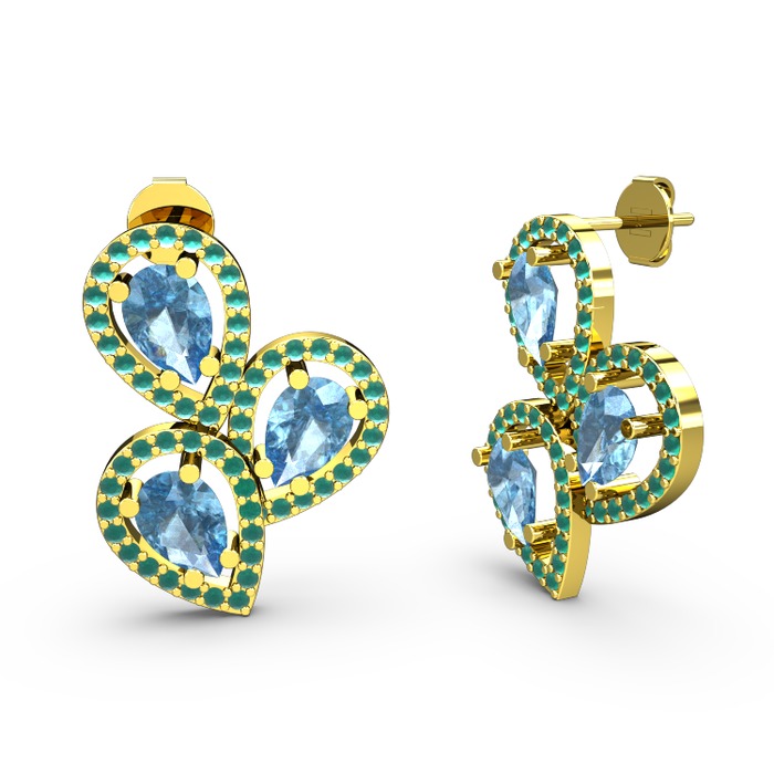 Kök zümrüt ve akuamarin 14 ayar altın küpe