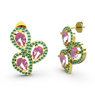 Kök zümrüt ve pembe kuvars 18 ayar altın küpe