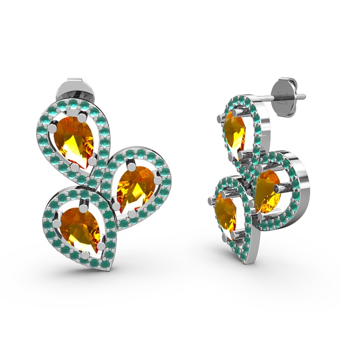Kök zümrüt ve sitrin 14 ayar beyaz altın küpe